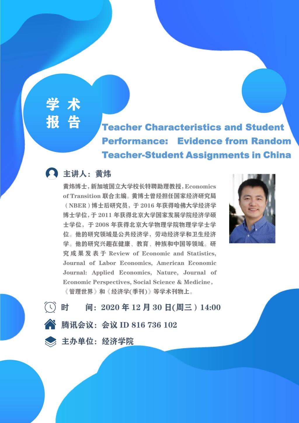 学术报告预告:Teacher Characteristics and Student Performance:Evidence from Random Teacher-Student Assignment in China
