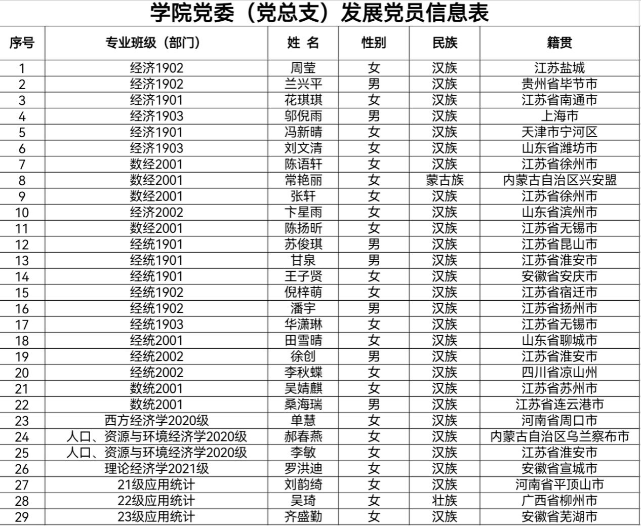 根据《发展党员工作实施细则》有关规定,经学院基层党支部考察、学院党委预审,拟接收周莹等29名同志为中共预备党员。现将名单予以公示: