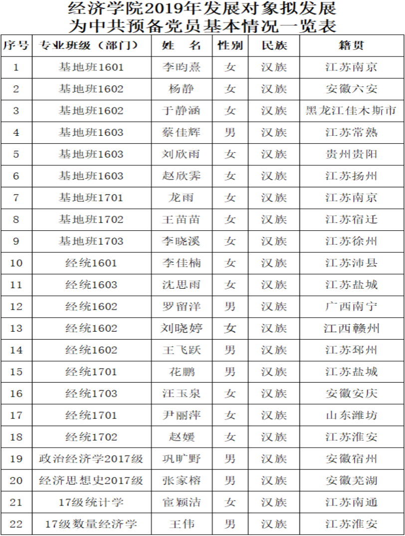 根据《发展党员工作实施细则》有关规定,经学院基层党支部考察、学院党委预审,拟接收李昀熹等22名同志为中共预备党员。现将名单予以公示: