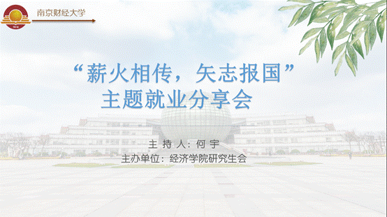 本次活动邀请到17级西方经济学的丁柏超、陈伟和18级应用统计的张振宇三位毕业班研究生,他们分别在求职、考博和就业方面取得了较为突出的成绩。活动过程中,丁柏超同学从职业方向选择、简历投递、笔试准备与面试发挥等方面讲述了自身的求职经历,并积极鼓励研究生同学们在一次次面试过程中积累发散性思维、培养严密的逻辑体系,也要提高语言表达能力,以期更好地回答面试官的问题。陈伟同学分享了考取上海财经大学博士生的经验,强调了研究生期间作出良好成果对于后期学校选择的重要性,他认为扎实的专业基础知识、高效的时间管理计划与良好的身体素质是使自身在竞争中脱颖而出的关键原因。张振宇同学分析了花都影视