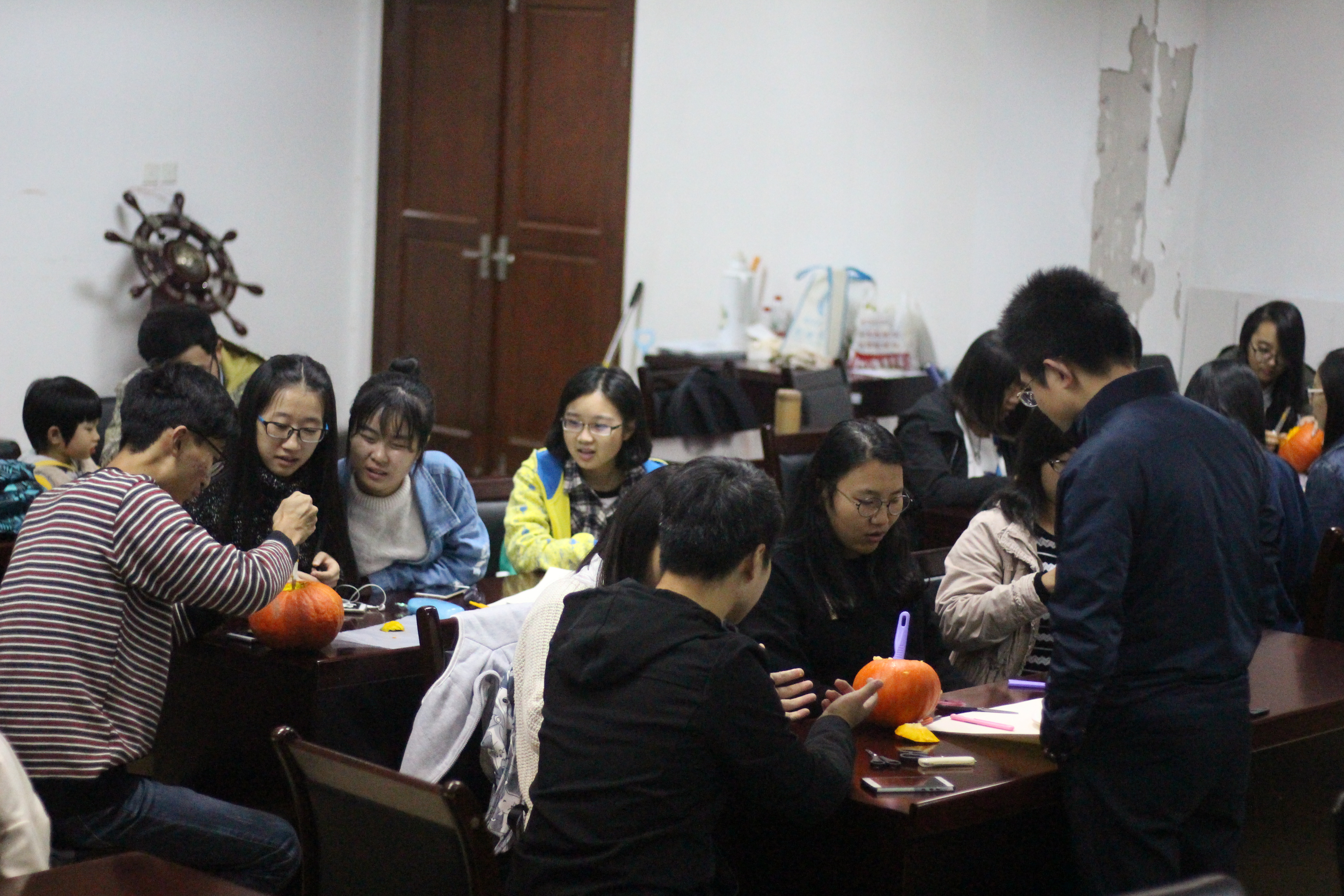 英语角的师生们在经济学科楼307室举办了制作南瓜灯活动。花都影视