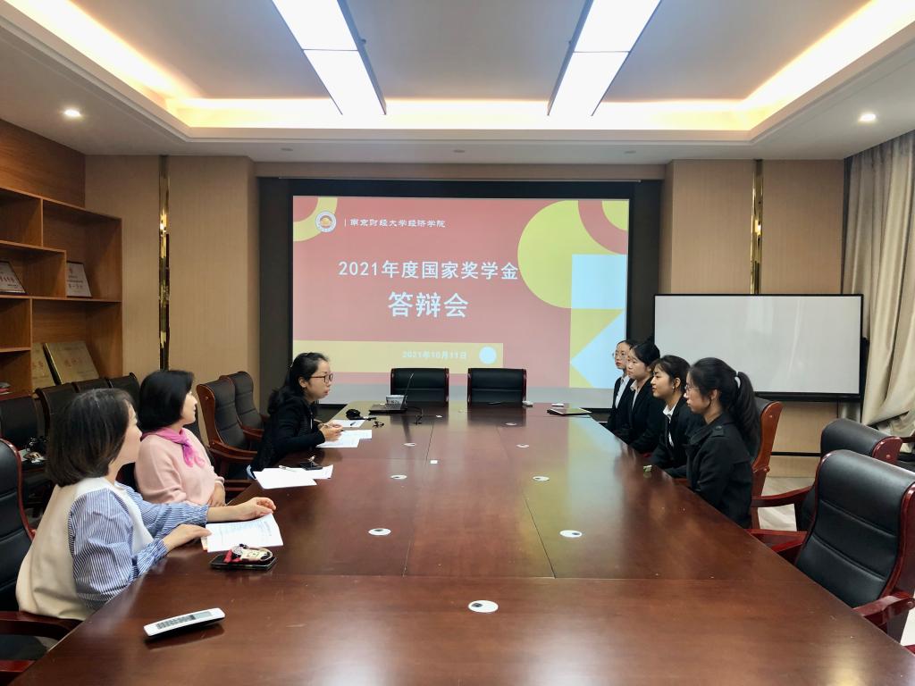 在德经楼323会议室举行2021年度国家奖学金答辩会。院党委副书记袁怡琨、学工办主任尹海燕和辅导员代表黄晓娟、徐昊翔担任答辩评审委员,部分19级学生观摩了此次答辩会。