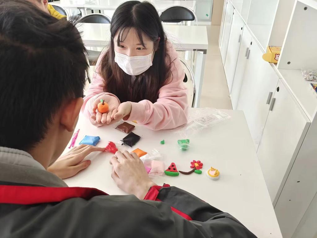 随后,志愿者们还通过一对一手工教学,与学员们共同制作手工黏土。志愿者带领学员们运用黏土制作起了各式各样的小手工,学员们充分发挥想象力和动手能力,成功制作出了一个个独特的黏土作品。部分学员因手部控制力的原因自主完成作品较为困难,细心的志愿者便手把手引导他们进行制作,整个现场呈现出一种和谐友爱的氛围。完成手工后,学员们欣喜地看着自己的作品,纯真阳光的脸上洋溢着满满的笑容。
