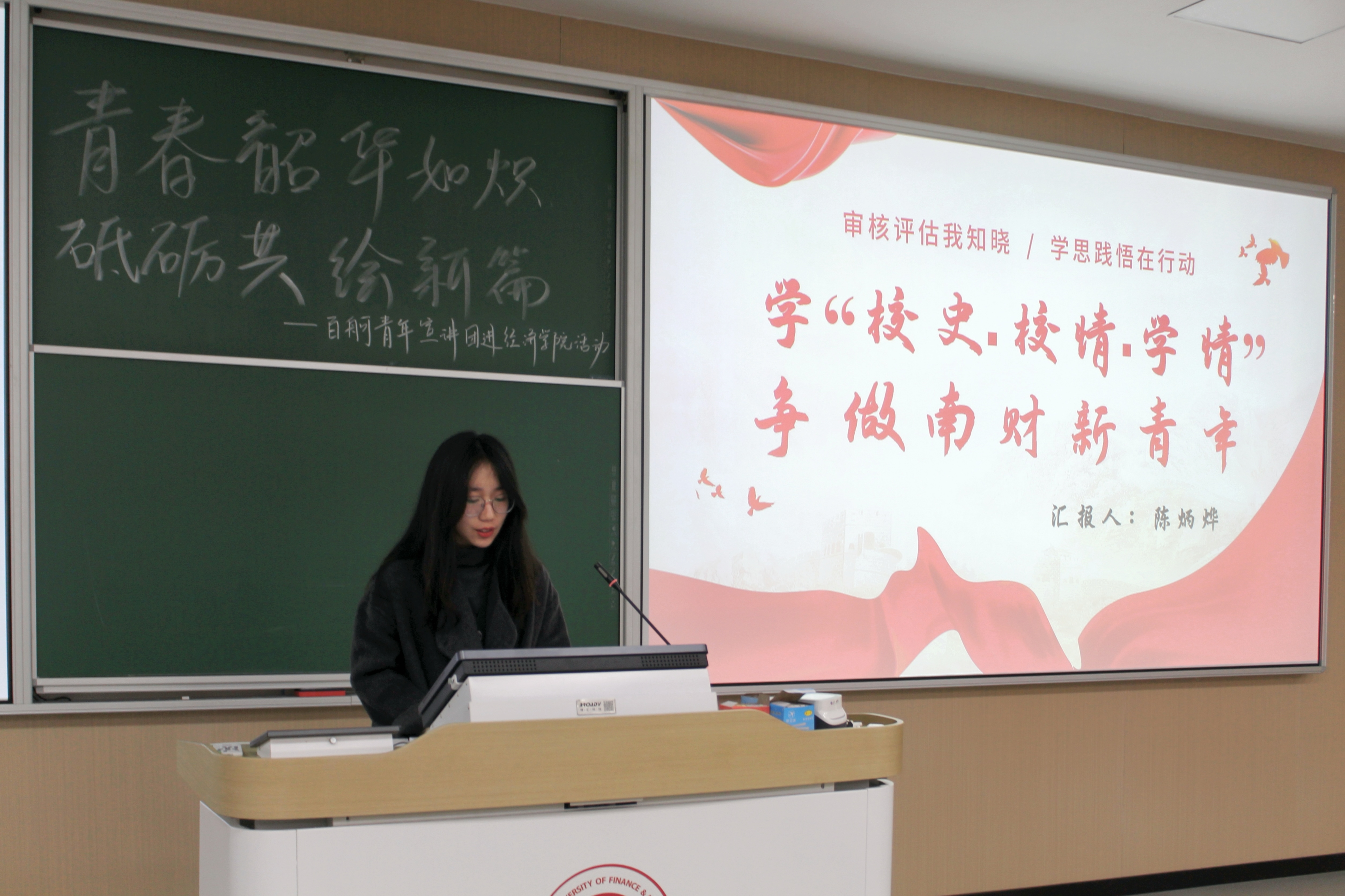 百舸青年宣讲团成员陈炳烨同学则将青年的责任与学校的文化传承紧密联系,引领南财学子一同探寻南财的辉煌历程,感受学校的文化底蕴。在宣讲的尾声,她详述了审核评估的作用与重要性,并鼓励南财学子积极参与,从课堂到课外全方位展现良好素养,以建设者之姿、奋斗者之姿,勇担使命,不负韶华,投身于中华民族伟大复兴事业。