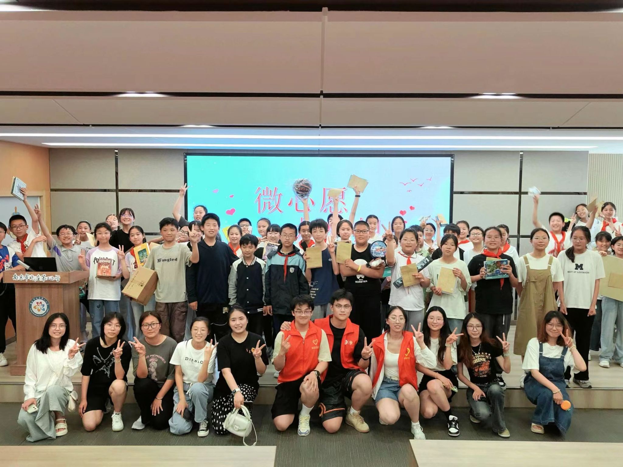 的志愿者们和南京晓庄第二小学的孩子们合影留念,记录下了这一难忘的瞬间。