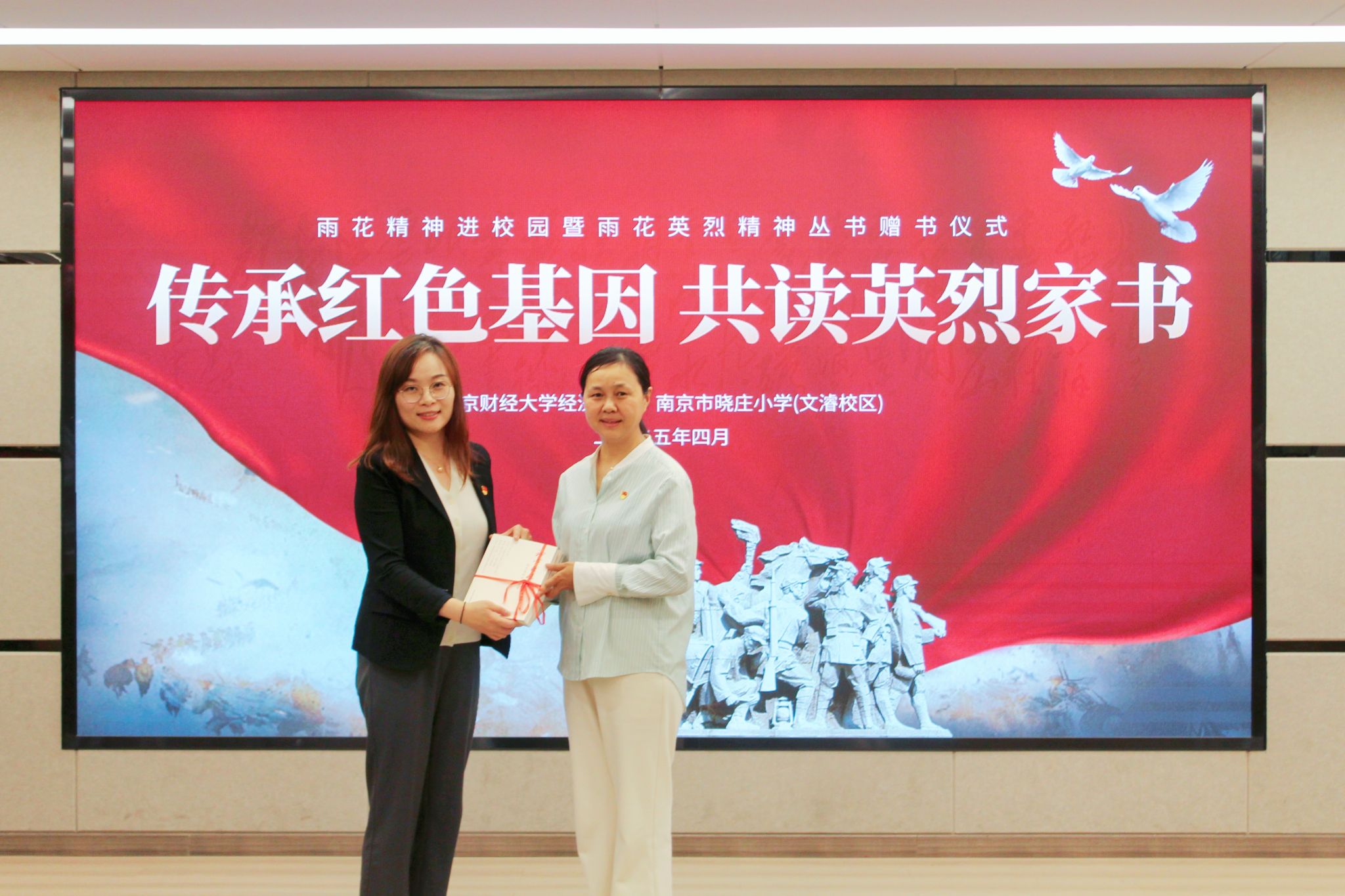 向晓庄小学捐赠雨花英烈精神丛书,双方代表共同完成赠书仪式。随后,大学生代表深情诵读了郭凤韶、朱杏南、周执中等革命先烈的家书,字句铿锵,再现了英烈们为理想信念献身的赤子之心。在“大手牵小手”共读环节,6名大学生与6名小学生结对共读史砚芬烈士的《诀别书》,通过跨学段互动,让红色精神在共情共鸣中薪火相传。