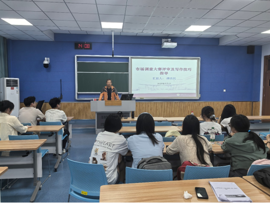 入围本科组线下决赛的5支队伍进行了两次线下指导讲座。讲座的题目分别是“市场调查大赛评审及写作技巧指导”和“市场调查大赛指导经验分享”。柳老师从自己多年指导和评审经验出发,针对参赛队伍的作品打磨、PPT制作和表演展示各个环节进行了一一点评,随后进行了认真细致的讲解和指导。