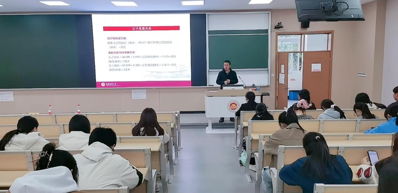 随后,丁辉老师作《统计的双重属性——科学之严谨与艺术之创造》专题讲座。他从统计学的双重属性出发,引用高尔顿关于父子身高关系的研究、《挑战不可能》节目中利用身高与脚印长度辨人的案例,以及尿布与啤酒常被一起出售的有趣现象等生动实例,揭示了统计学的科学属性。接着,他通过轰炸机案例中应用的逆向思维、辛普森悖论等实例,阐述了统计学的艺术性。丁辉老师以深入浅出的方式,系统地阐述了统计学的多元形式,进一步加深了学生们对统计学的理解和认识。