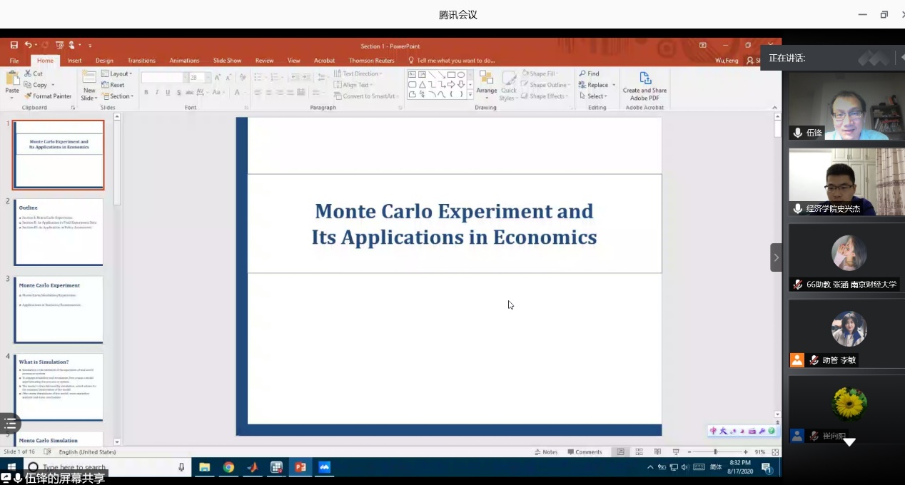 8月18日上午,美国佛罗里达大学研究助理伍峰教授为暑期学校的学员们作了题为“蒙特卡洛方法及其应用”的专题讲座。讲座由我校史兴杰副教授主持,暑期学校全体成员及我校部分青年教师参与了此次讲座。
