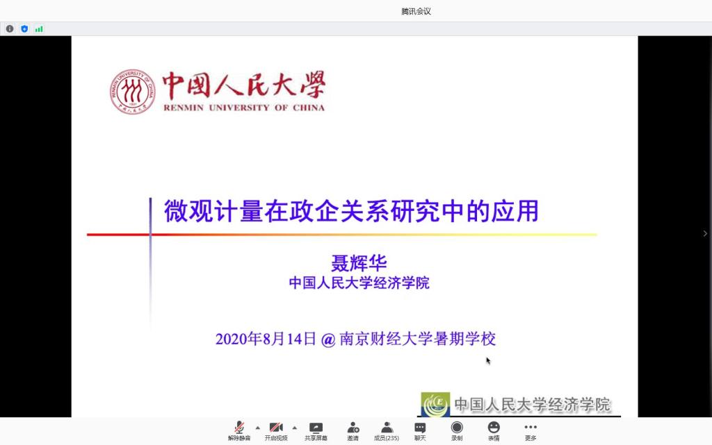8月14日下午,中国人民大学聂辉华教授为暑期学校的学员们作了题为“微观计量在政企关系研究中的应用”的专题讲座。讲座由花都影视