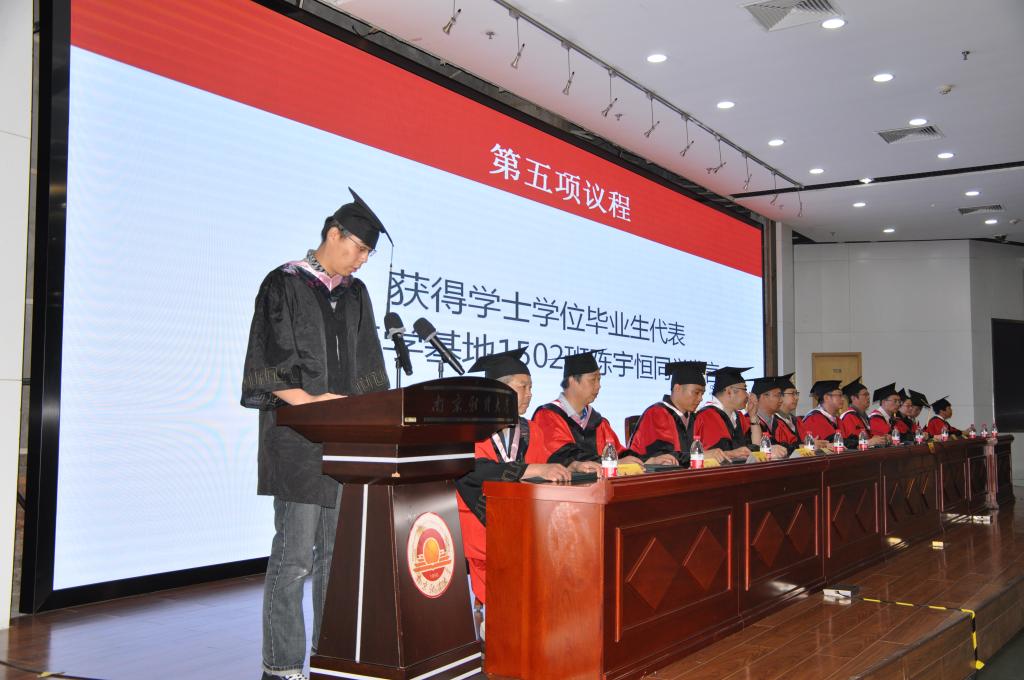 基地1502班陈宇恒同学作为毕业生代表发言。他首先向辛勤培育同学的领导与老师表示由衷的感谢,向全体毕业生表示真诚的祝福。他回顾了四年大学生活的每一瞬间,分享了四年来发生在花都影视