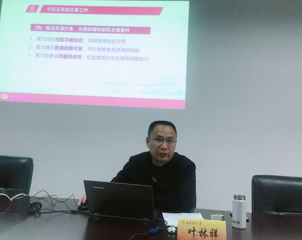 叶林祥教授首先简要说明了第三次党代会概况,并通过回顾五年来的工作成绩,对我校的思想建设、党建工作、办学水平和办学环境给予肯定。叶教授认为,我校要向着“加快建设特色鲜明的高水平财经大学”的目标不断前进,以习近平新时代中国特色社会主义思想为指导,进一步实行五项战略,在保留我校财经底色、粮食特色的基础上不断创新,坚持引培并举,拓展国际办学的广度和深度,保证师生员工在共享发展中获得更多的满足感、幸福感。叶教授指出,我校今后五年的工作要以优化布局、协同发展、完善治理、资源共享和增进福祉为重点展开,坚持优化建设布局,形成高水平大学办学体系。叶教授最后强调,此次学校党代会是一次统一思想、凝心聚力的大会,必将对我校改革发展产生重大而深远的影响,载入我校发展的光辉史册。