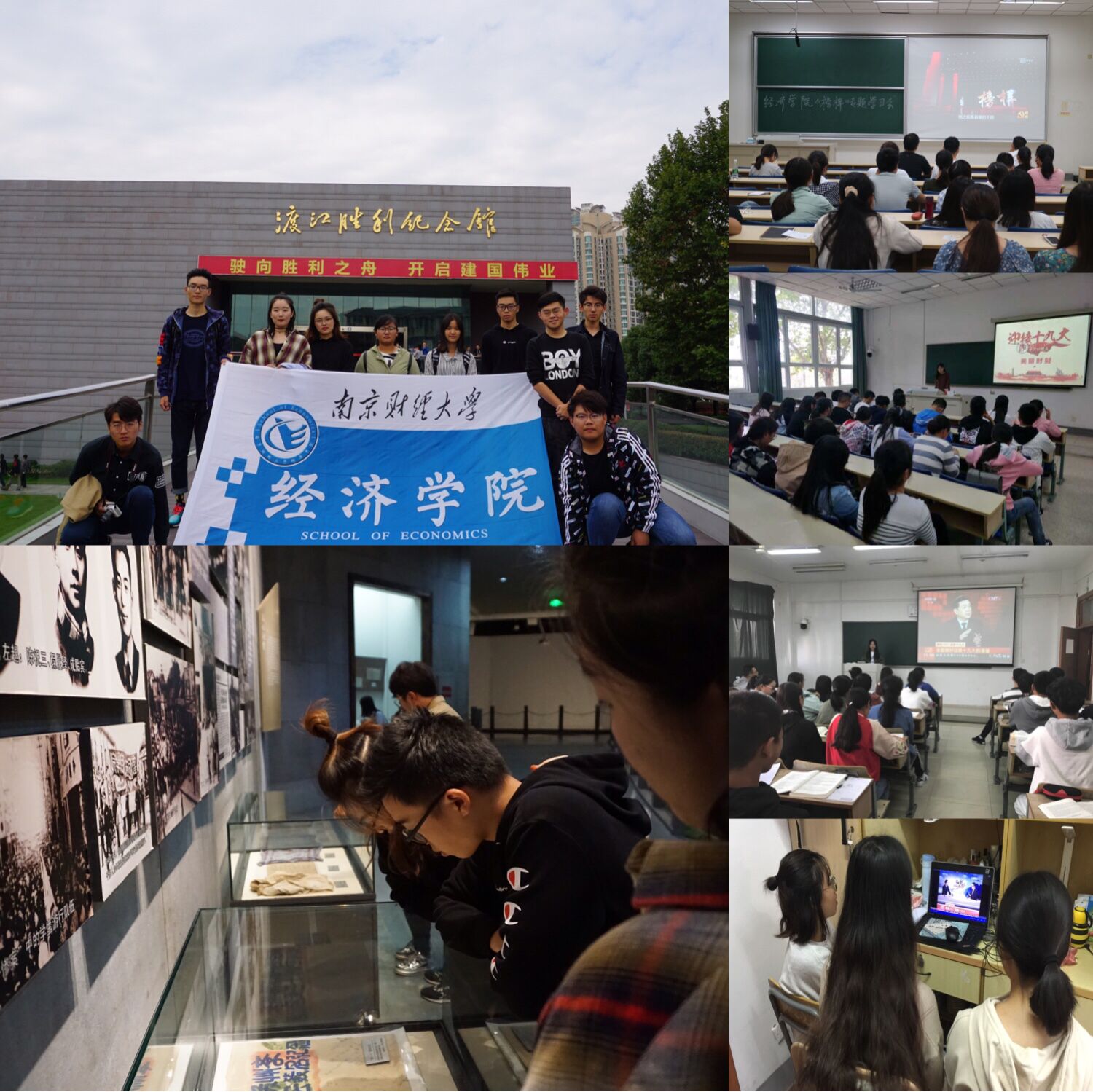学生组织了“不忘初心,继续前进”南京渡江纪念馆参观活动。渡江胜利纪念馆丰富的展品、生动的展出让同学们深刻体会到战役的残酷与艰辛,体会到先辈面对战斗时的勇敢无畏。10月14-15日,学院各班级开展了形式多样、内容丰富的团支部活动。其中,基地1702班“不忘初心,逐梦前行”主题班会、基地1602班“不忘初心跟党走”讲座、经统1702“青春喜迎十九大”视频展等活动,同学们均积极参与其中,表示将以实际行动和优异成绩向党的十九大献礼。学院分团委副书记吴风清同学表示,通过系列活动,同学们不仅学习到了许多有关党代表大会的知识,汲取了精神养分,更增强了对党和祖国的热爱之情。