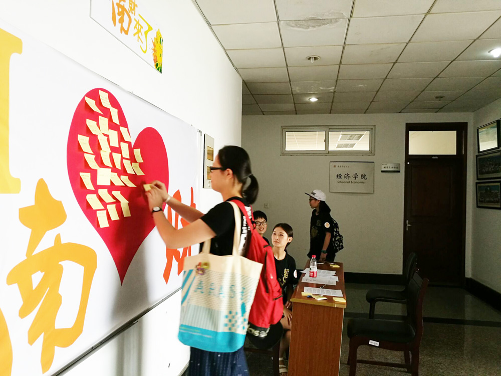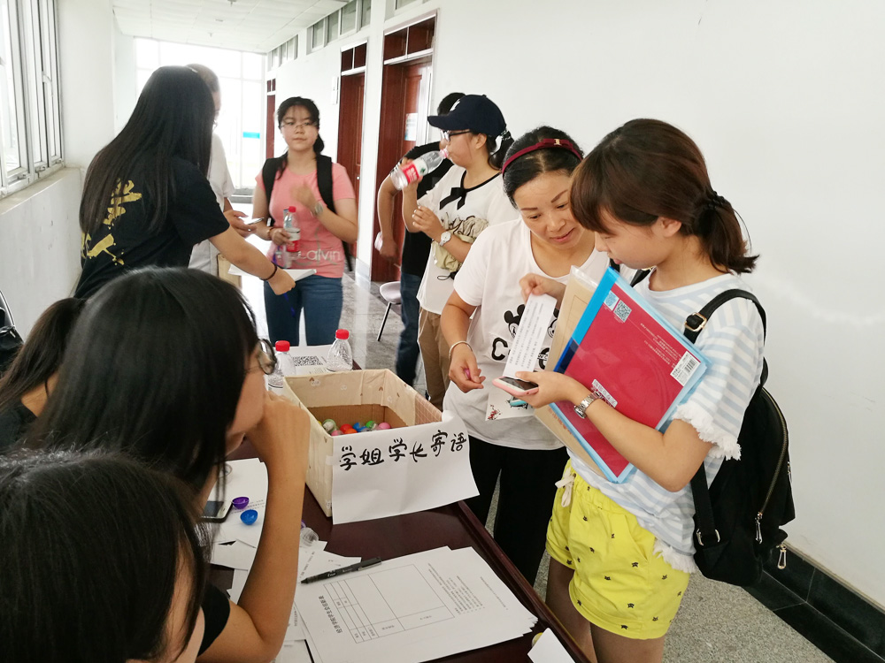 党员干部、学生干部以及大二各班学生代表组成的迎新志愿服务队,秉着“爱由心生,竭诚服务”的原则,忙碌穿梭于经济学科楼与北苑宿舍之间。引领报到的路上,热情的志愿者们给新生及家长们介绍起校园的建筑及周边环境,以及自己大学的经历与经验。家长和新生们听的仔细认真,志愿者们回答的耐心细致,每个人脸上都洋溢着喜气和欢乐。四里有余的路程一点儿也不觉得漫长,反而意犹未尽。