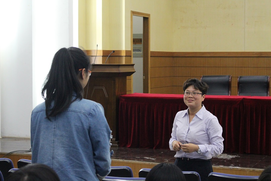 程宁女士从工作选择所要考虑的因素开始,给同学们具体介绍了银行的分类,银行业的具体收入,银行招聘的时间和具体流程等。随后,程宁女士给同学们进行了具体的银行应聘策略指导,包括网申指导、笔试指导及面试指导。网申过程中,程宁女士强调简历的真实性、情报的通达性和关系的丰富性是网申通过的重要保证。就如何应对笔试,她告诉同学们要提前做好准备,用过硬的专业知识强化自己。就如何应对面试,程宁女士与同学们进行了现场互动和实际模拟,使同学们了解了面试的具体形式及过程。