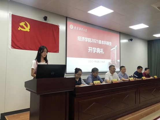 2021级新生开学典礼以腾讯会议形式线上直播。院党委书记陈耀辉、院长朱红根、党委副书记袁怡琨、副院长崔向阳、尹敬东、韩中、学工秘书尹海燕、分团委老师兼辅导员梁少颖等参会。党委副书记袁怡琨主持典礼,2021级全体新生在各自的宿舍观看直播,线上参与。