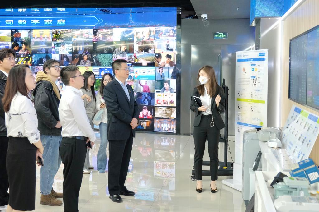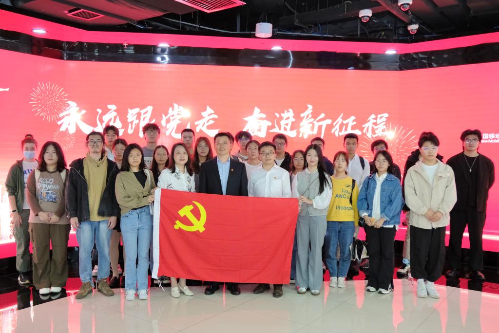 师生的到来表示热烈欢迎,陪同张圣兵书记一行参观了江苏移动创新展示体验中心。中心围绕中国移动通信集团“连接+算力+能力”战略方针,综合展示了江苏移动赋能各行业数智化转型的应用,详细展现了数智化赋能下产业升级的澎湃动力。