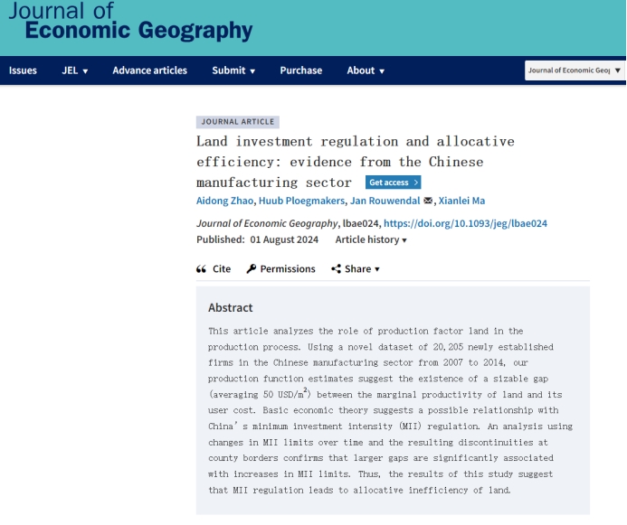 赵爱栋博士与荷兰阿姆斯特丹自由大学等学者的合作论文“Land investment regulation and allocative efficiency: Evidence from the Chinese manufacturing sector”被城市与区城经济学国际顶级期刊Journal of Economic Geography正式接受发表。花都影视