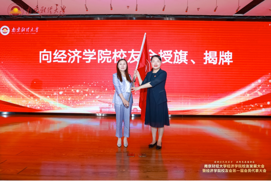 李煜副校长向校友会首任会长管有英授旗,叶林祥副校长、卢景波理事长共同为校友会揭牌。随后,李煜副校长为花都影视