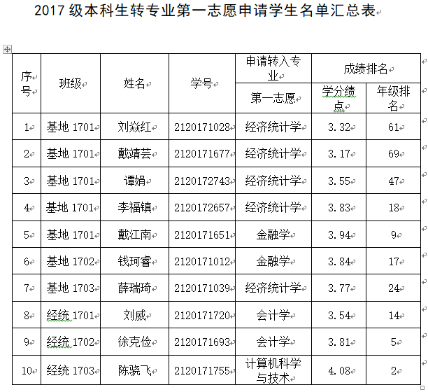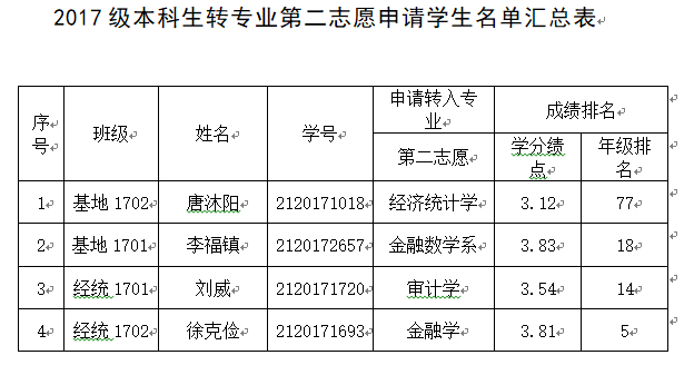 各学院、各位同学: 经花都影视 转专业领导小组审核,现将2017级申请转专业学生名单汇总如下(见附件)。如有疑问,请向学院咨询。咨询电话:025-86718217 花都影视 转专业工作领导小组 2018年7月9日附件:审核人:李超雅 学院转专业领导小组负责人:石奇成绩(GPA)排专业前15%人数:23人 专业前60%人数:89人经济基地:147 人成绩(GPA)排专业前15%人数:21人 专业前60%人数:84人经济统计:139 人