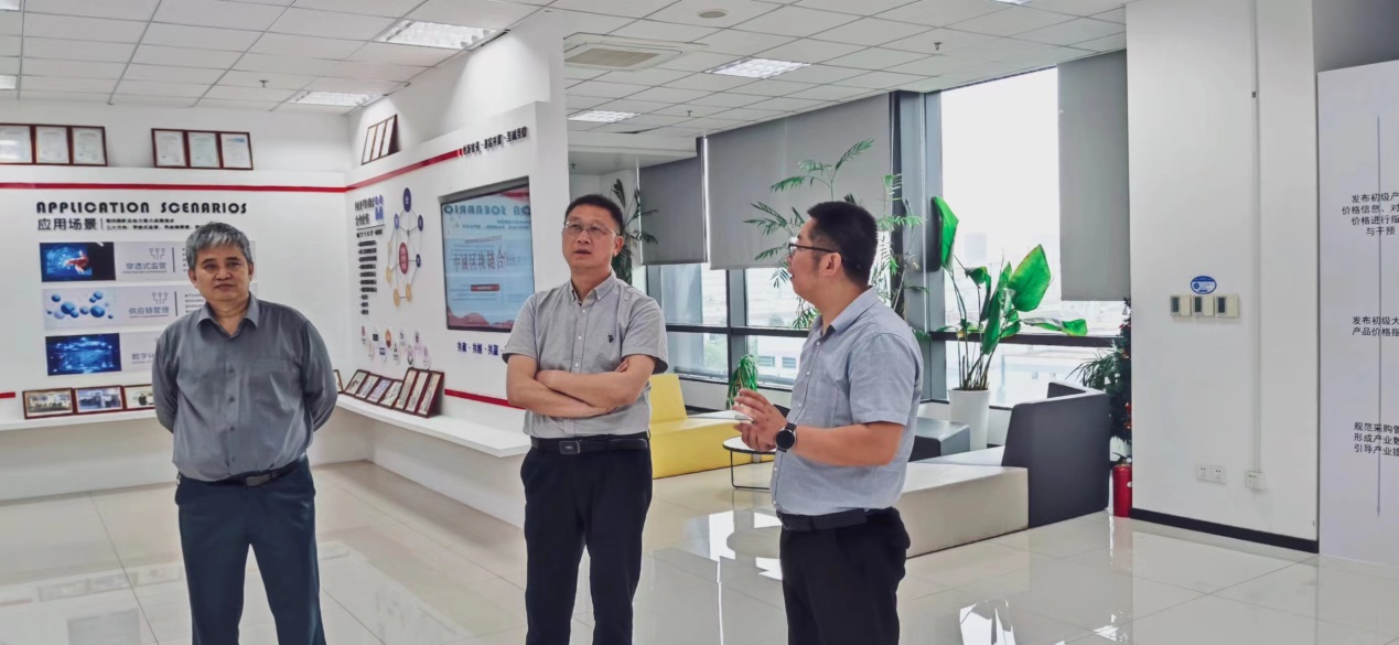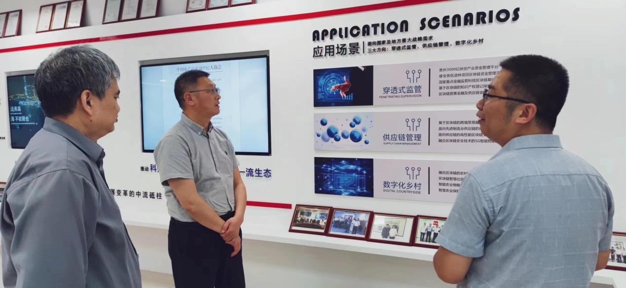 中诚区块链研究院汪洋总经理对花都影视 领导的到来表示热烈欢迎,并带领朱红根院长一行参观了中诚区块链研究院(南京)有限公司展厅,详细介绍了中诚区块链研究院的发展背景、基本情况及在金融监管、数字农业方面的应用场景。