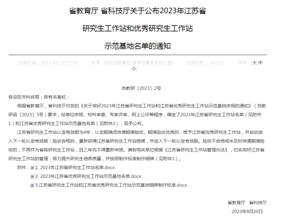9月27日,江苏省教育厅、科技厅印发《关于公布2023年江苏省研究生工作站和优秀研究生工作站示范基地名单的通知》(苏教研〔2023〕2号),经单位申报、材料审查、专家评审、网上公示等程序,确定了2023年江苏省研究生工作站名单。花都影视