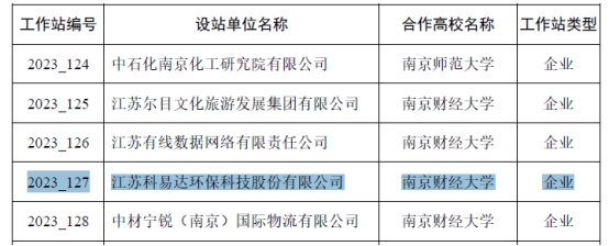 申报的江苏科易达环保科技股份有限公司被批准为2023年江苏省研究生工作站。