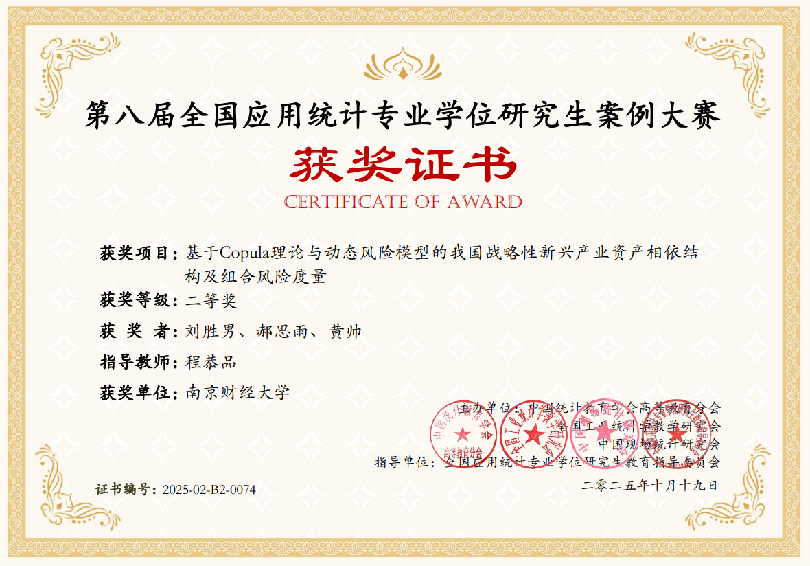 1.获奖项目:基于Copula理论与动态风险模型的我国战略性新兴产业资产相依结构及组合风险度量;获奖等级:一等奖;获奖者:刘胜男、郝思雨、黄帅;指导教师:程恭品