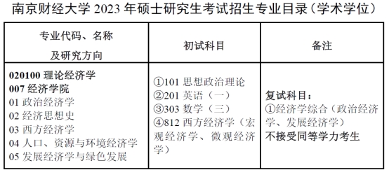 2023年硕士研究生招生学科(专业)共4个:0201理论经济学(学硕)、0202应用经济学(数量经济学方向,学硕)、0270统计学(学硕)、0252应用统计(专硕)。