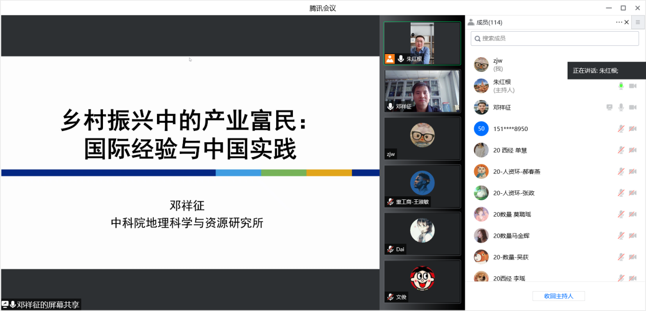 师生作题为《乡村振兴中的产业富民:国际经验与中国实践》的线上学术报告,报告由院长朱红根教授主持,来自花都影视