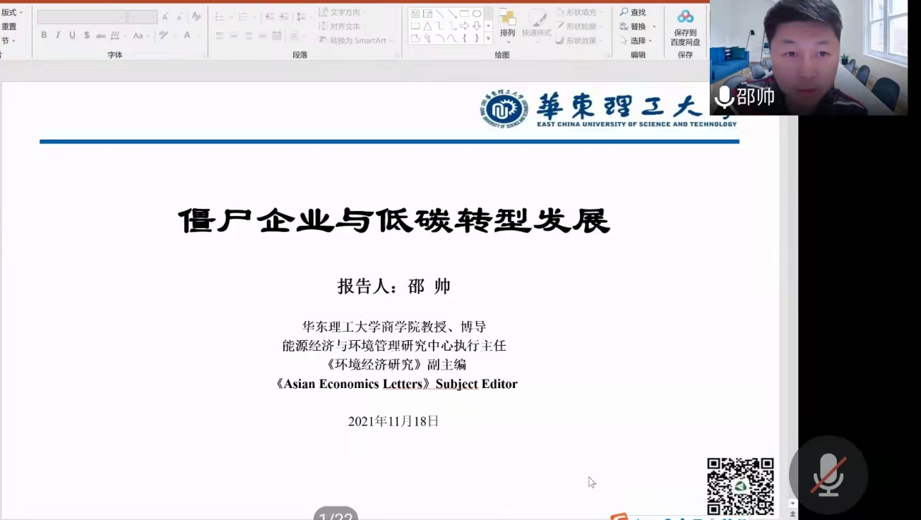 邵帅教授首先介绍了我国“双碳”目标与低碳转型发展困境,他指出,产能过剩问题一直是我国低碳转型发展过程中存在的一大症结,产能过剩较为严重的行业往往也是僵尸企业较为密集的行业。然后,邵帅教授讲述了僵尸企业对碳排放绩效影响的理论机制与特征事实。再次,邵帅教授进行实证策略与结果展示,来说明僵尸企业确实会对碳排放绩效产生影响。最后,邵帅教授进行总结并给出相应的政策含义,他指出我国要加快推进僵尸企业处置、有效释放地区沉淀资源,优化地区资源配置。