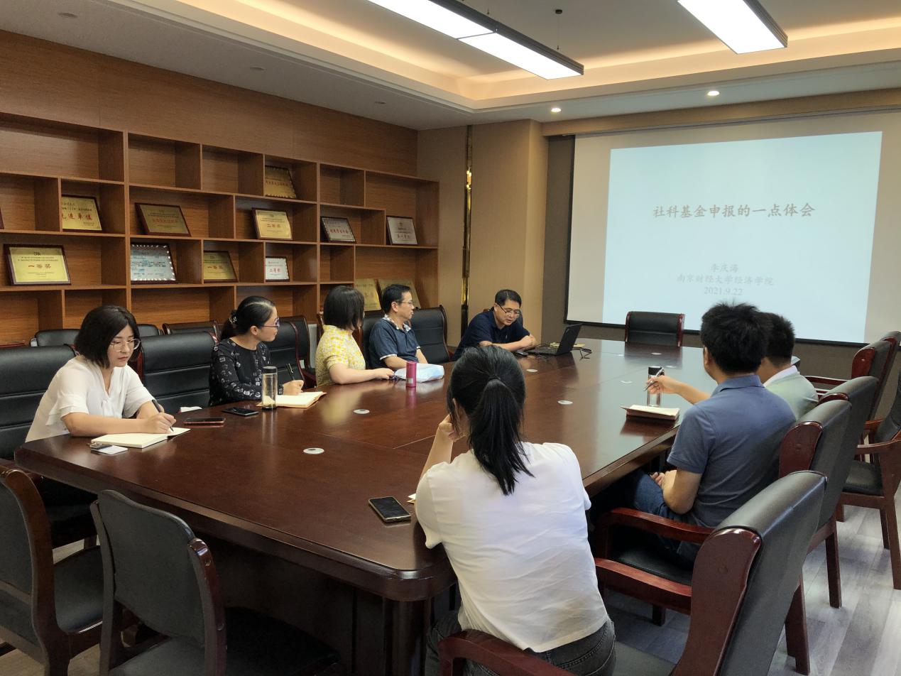 第二期2021年度国家基金项目申报经验交流会在德经楼323会议室举行,学院邀请了李庆海老师和王娟老师给全院青年教师做基金申报经验分享和心得交流,副院长尹敬东出席并主持了本次会议。