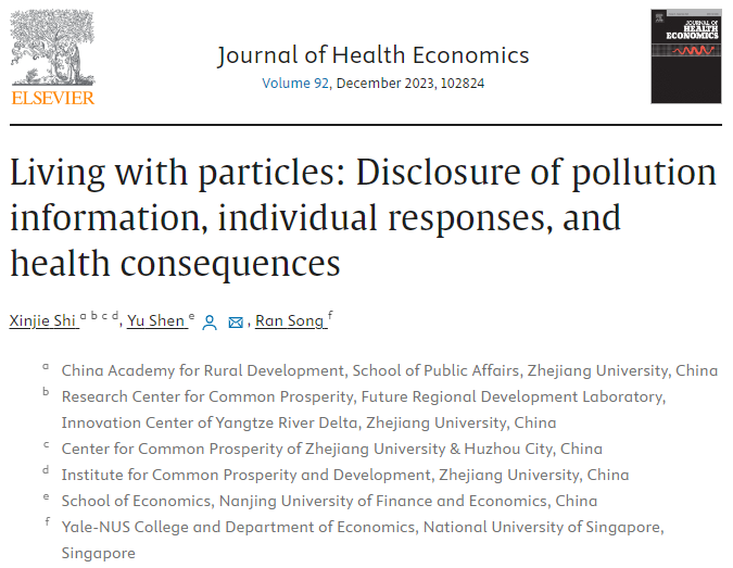 近日,花都影视 青年教师沈煜博士以通讯作者的学术论文“Living with particles: Disclosure of pollution information, individual responses, and health consequences”在Journal of Health Economics在线发表,以第一作者的学术论文“The effect of low-carbon city pilot on energy consumption behavior: Evidence from China”在Energy Economics在线发表。