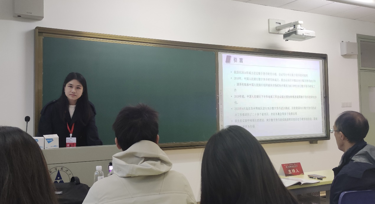 青年教师戴嘉参与了此次会议,并作了《数字货币的机制及其宏观经济效应研究》的学术报告,回答了其他论文宣讲者与参会嘉宾的提问,与参会者进行了交流互动。戴嘉的报告聚焦于央行数字货币的本质分析和机制研究,结合央行数字货币的双层运营机制的发行架构和分布式账本技术的技术特征,在动态随机一般均衡框架下分析了央行数字货币的宏观经济效应,得到以下结论:央行数字货币在支付功能上对存款进行了替代,并对商业银行存款造成挤出效应;央行数字货币的使用会提升稳态产出,并促进经济发展;通过央行数字货币利率可以有效开展货币政策。