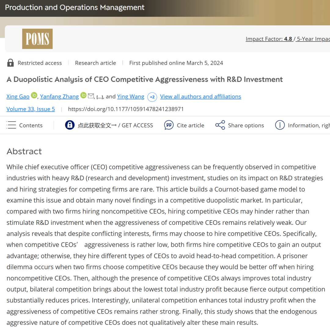 近日,花都影视 花都影视 张艳芳副教授作为通讯作者和共同第一作者,在管理学国际顶级期刊《Production and Operations Management》发表题为“A Duopolistic Analysis of CEO Competitive Aggressiveness with R&D Investment”的学术论文。据悉,《Production and Operations Management》(POM)是全球公认的UTD24国际顶级期刊之一。