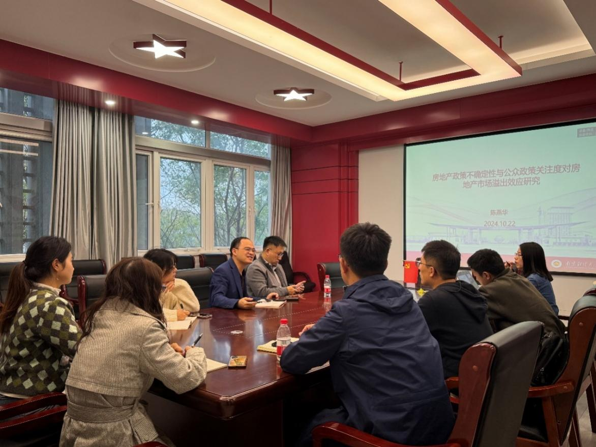 在德经楼会议室329举办了双周学术论坛。本期论坛由陈燕华老师带来主题为“房地产政策不确定性与公众政策关注度对房地产市场溢出效应研究”的学术交流。陈杰副教授主持了本次学术论坛,学院部分教师参与。