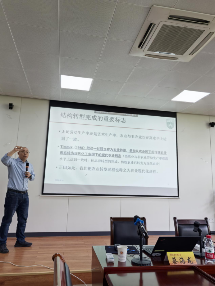 讲座中,蔡海龙教授探讨了农业现代化的普遍规律与中国实践。农业转型具备结构转型特征,如农业产出和就业占比下降等,且结构转型与经济增长互为因果,完成标志是农业与非农产业生产率在高水平趋同。中国农业发展历经农业主导、支持工业、工业反哺、现代化四个阶段,当前面临劳动力转移放缓、农业占比下降压力大等挑战,推进农业现代化刻不容缓。对此,他提出提高单位产值、创新组织模式、应对政策约束三条路径,用以推动农业现代化。